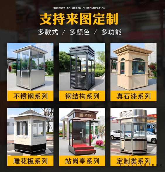 定制款岗亭:支持尺寸、材质、颜色个性化定制,可根据需求加装 LED 显示屏、智能锁、监控摄像头、SPC 防水地板、集成配电箱等增值配置,满足特殊场景的功能需求。